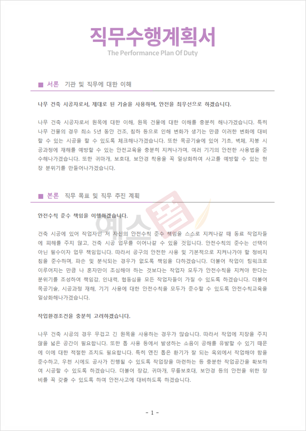 직무수행계획서 샘플(양식.서식) 검색자료