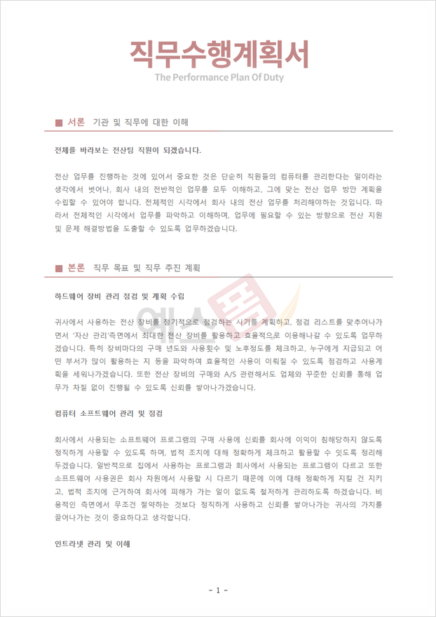 직무수행계획서 예시 (전산관리) |