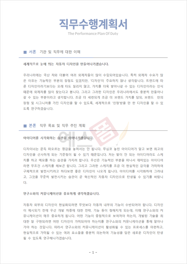 직무수행계획서 양식 (디자인/자동차) |