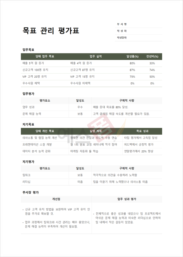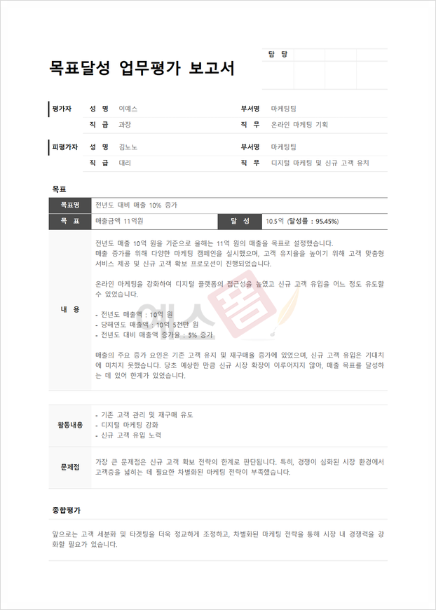 직원의 업무 목표와 성과를 체계적으로 평가하기 위해 사용되는 목표 관리 평가표 양식입니다. 업무 목표와 자기 목표 항목을 강조하여 서술하기 용이한 디자인으로 구성되어 있습니다. 마케팅팀 직원의 목표 수행 내용과 그에 대한 평가 내용의 목표관리 평가표 예시가 포함되어 있습니다.