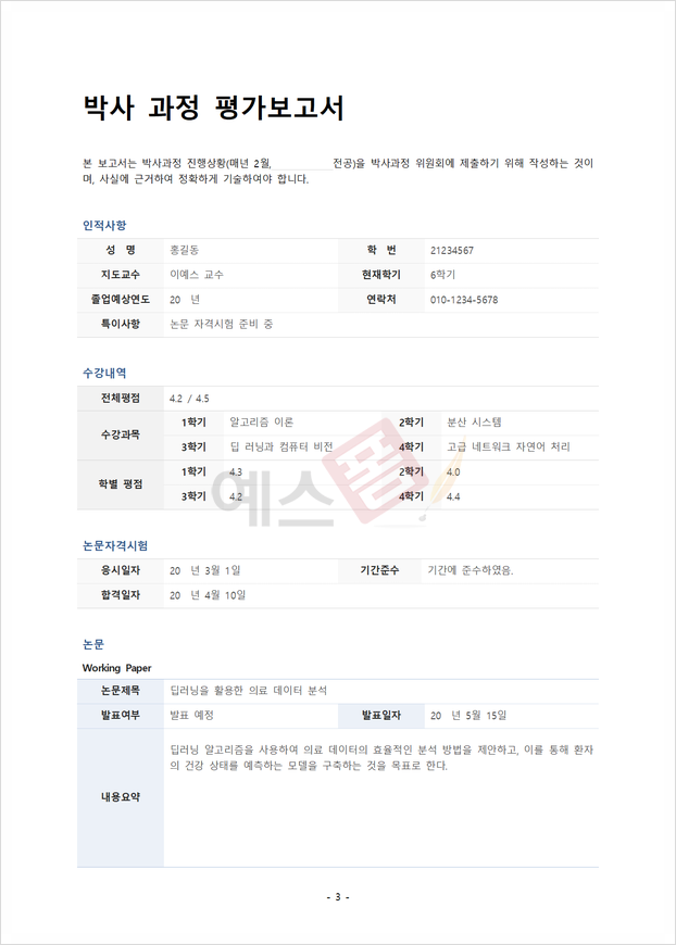 박사 과정 학생의 학업 및 연구 진행 상황을 점검하고 기록하기 위해 작성하는 박사과정 평가 보고서 양식입니다. 컴퓨터 공학 전공의 박사 과정을 밟고 있는 대학원생에 대한 평가 내용의 박사과정 평가 보고서 예시가 포함되어 있습니다. 대학원생이 작성한 논문에 초점을 두어 평가할 수 있는 디자인으로 제작되었습니다.