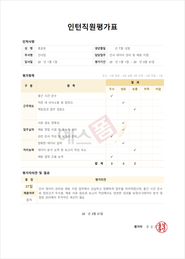 인턴사원의 근무 태도와 업무 성과를 평가하는 데 사용되는 인턴 직원 평가표 양식입니다. 근무태도와 팀워크가 우수하지만 처리 능력이 다소 미흡한 인턴사원에 대한 평가가 항목과 점수에 따라 기재된 인턴 직원 평가표 예시가 포함되어 있습니다.