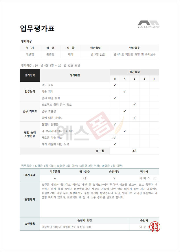 오늘은 직무에 적합한 평가 항목을 구성하는 방법부터 업무 평가 주기를 어떻게 설정하면 좋을지에 대해 알아볼 예정입니다. 예스폼에서 새롭게 업데이트된 직원 평가표 양식, 업무 평가표 양식을 함께 추천드릴 예정이니 업무 평가표 양식, 직원 평가표 양식을 찾고 계셨다면 꼭 활용해 보시길 바라겠습니다.