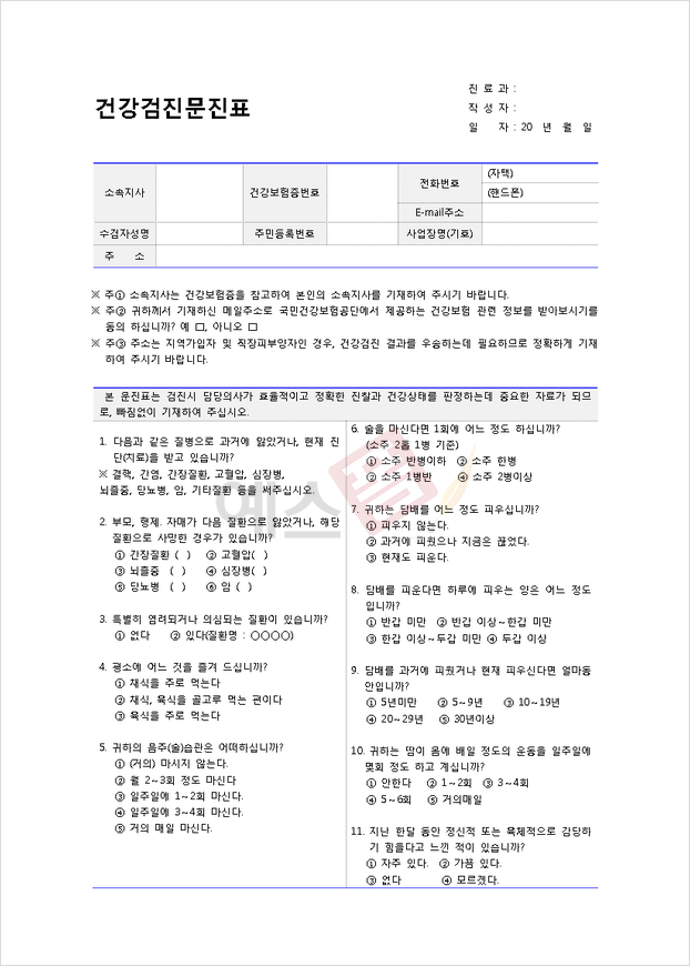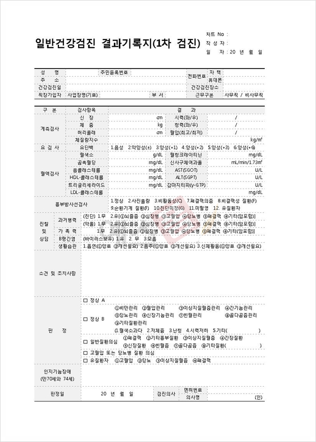| 건강검진문진표 | 건강검진 기본검사지 | 일반 건강검진 결과기록지 |