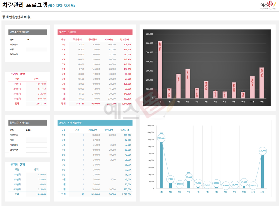 예스폼에서는 이러한 차계부를 작성하는 경우에 유용하게 활용할 수 있는 법인차량 차계부와 개인차량 차계부를 다운로드 받으실 수 있는데요. 차량의 정보를 입력하고, 지출 항목과 유종 등을 기재하여 차량의 주유 및 정비, 기타 지출 등의 내역을 한눈에 파악하고 관리할 수 있는 차량 관리(법인차량) 가계부라 볼 수 있습니다.