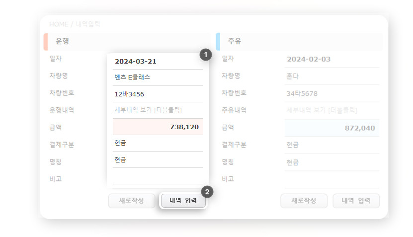 1️⃣ 일자, 차량명, 운행 내역, 금액, 결제 구분 등 내역을 입력합니다.
