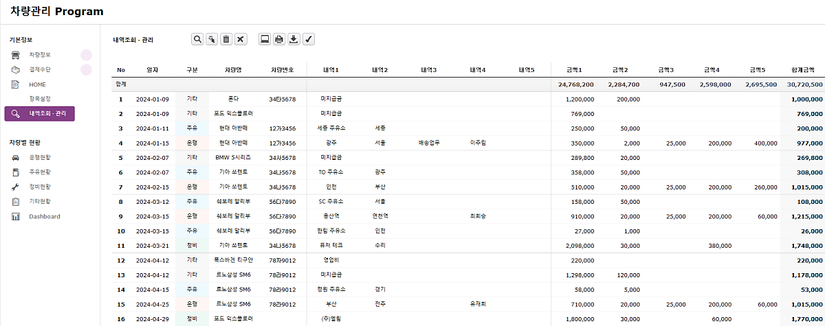 주유비, 통행료, 주차비, 식대, 부품비, 공임비 등 세부내역까지 나눠서 관리가 가능하며 연간/월별/일자별로 검색이 가능하므로 법인 차 및 회사 차 차량정비 일지, 차량 운행 일지, 차량 주위 일지로 활용 가능합니다. 차계부(차량 가계부) 및 차량관리 대장으로도 사용할 수 있습니다. 엑셀 초보자분들도 사용하실 수 있으니 하단에서 2024년 신규 차량관리 프로그램 소개 확인해 보시길 바랍니다.