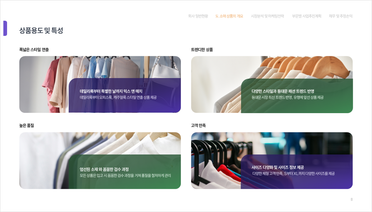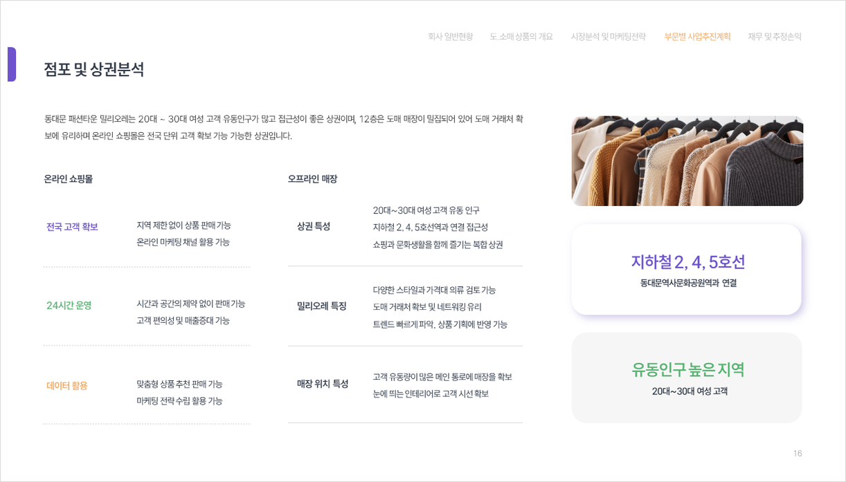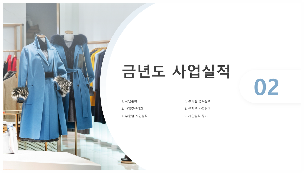 총 6페이지로 구성된 파워포인트 템플릿으로, 프레젠테이션용과 프린트용 속지가 구분되어 사용하기 편하게 디자인 되었습니다. 여성복이 걸려 있는 의류 매장을 이미지로 만든 쇼핑몰 템플릿