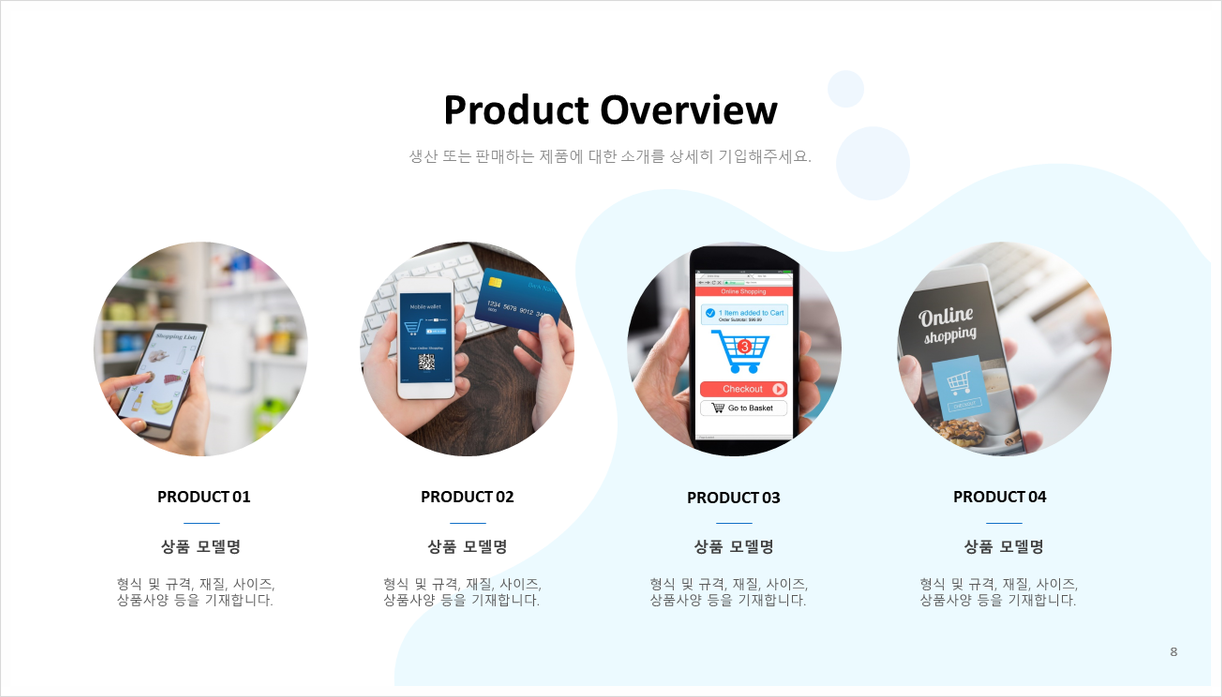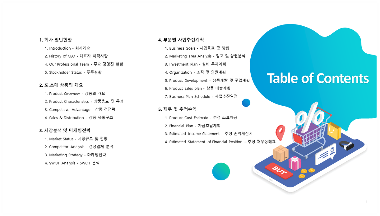 모바일 쇼핑몰 일러스트를 사용하여 디자인되었고 청년 창업계획서 양식, 창업 준비 계획서에 꼭 필요한 슬라이드들로 구성되어 있습니다.