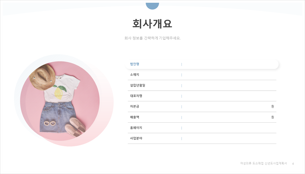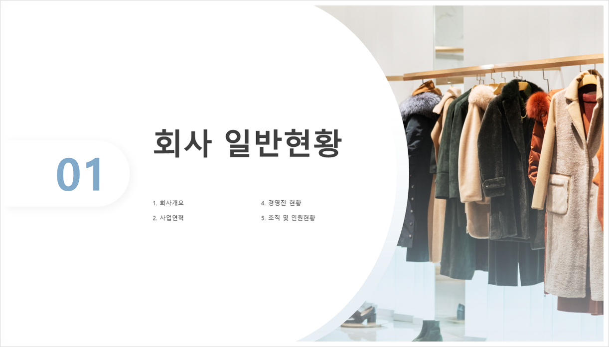 도소매업 신년도 사업계획서(의류전문점)입니다. 활용하기 좋은 여성의류 매장의 이미지가 다수 포함되어 있습니다. 다양한 다이어그램가 차트가 들어있습니다. 01. 회사 일반현황 1. 회사개요 2
