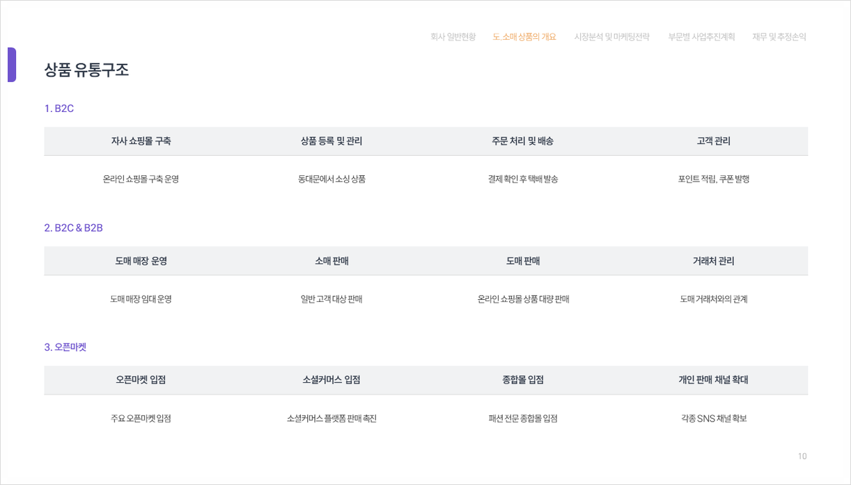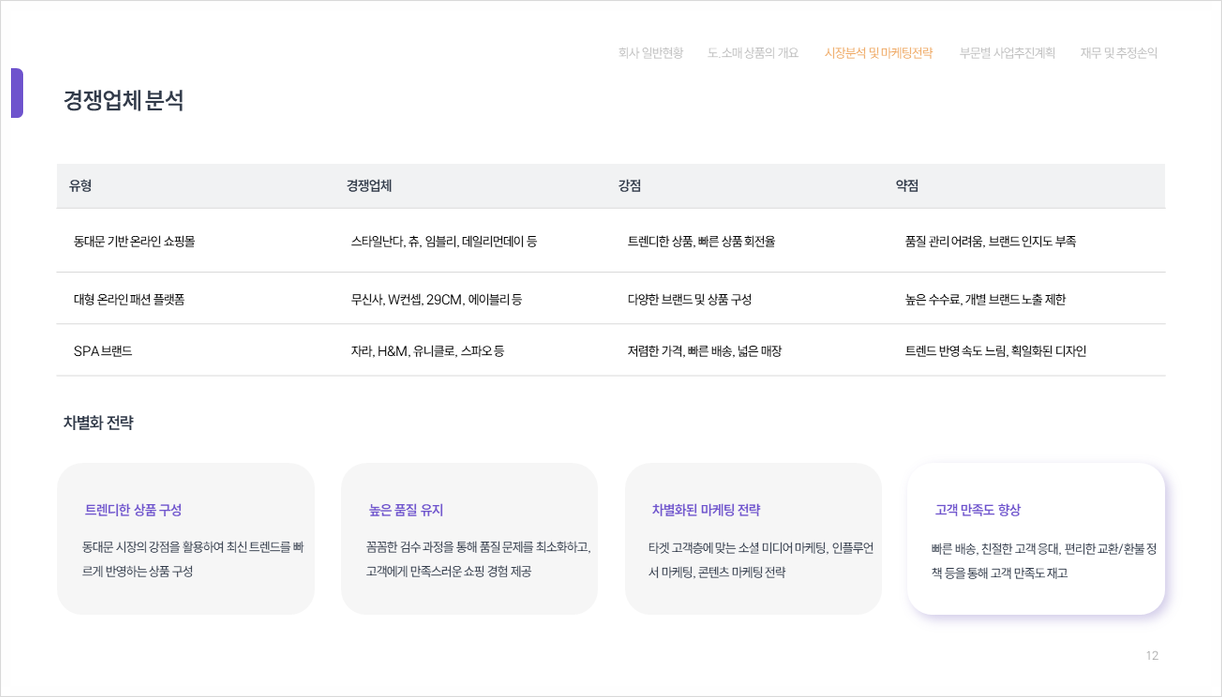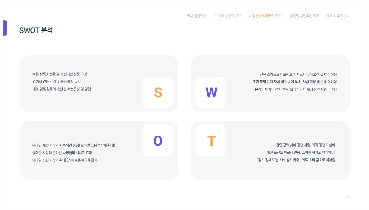 의류 쇼핑몰 도소매 창업 사업계획서 예시로 제작된 샘플 예제이며 실제 의류 쇼핑몰 도소매 창업에 도움 되는 목차와 템플릿으로 구성되어 있어 회사소개 및 각종 청년창업계획서 PPT 용도로 적용하기에 유용한 자료입니다. 정책 자금 신청, 금융권 대출, 기타 투자제안 시 도움 되는 양식입니다. 창업 준비 상황에 맞춰 목차 내용을 늘리거나 줄이면 됩니다.