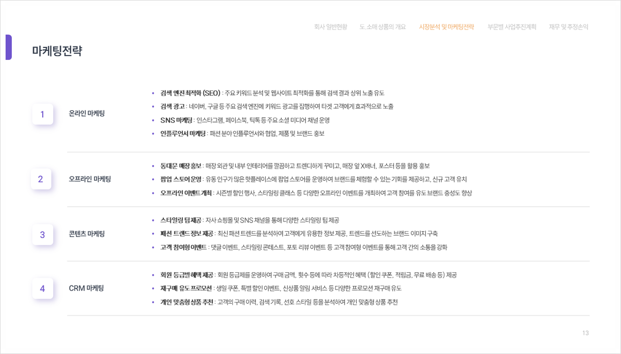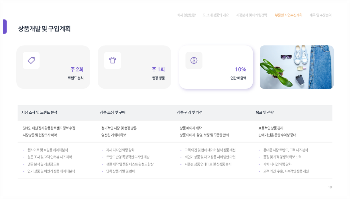 - 타깃 고객 설정 : 연령, 성별, 라이프스타일, 구매 습관 등 다양한 요소를 고려해 목표 고객을 설정하세요. 고객의 니즈와 기대에 부합하는 상품을 기획할 수 있습니다.