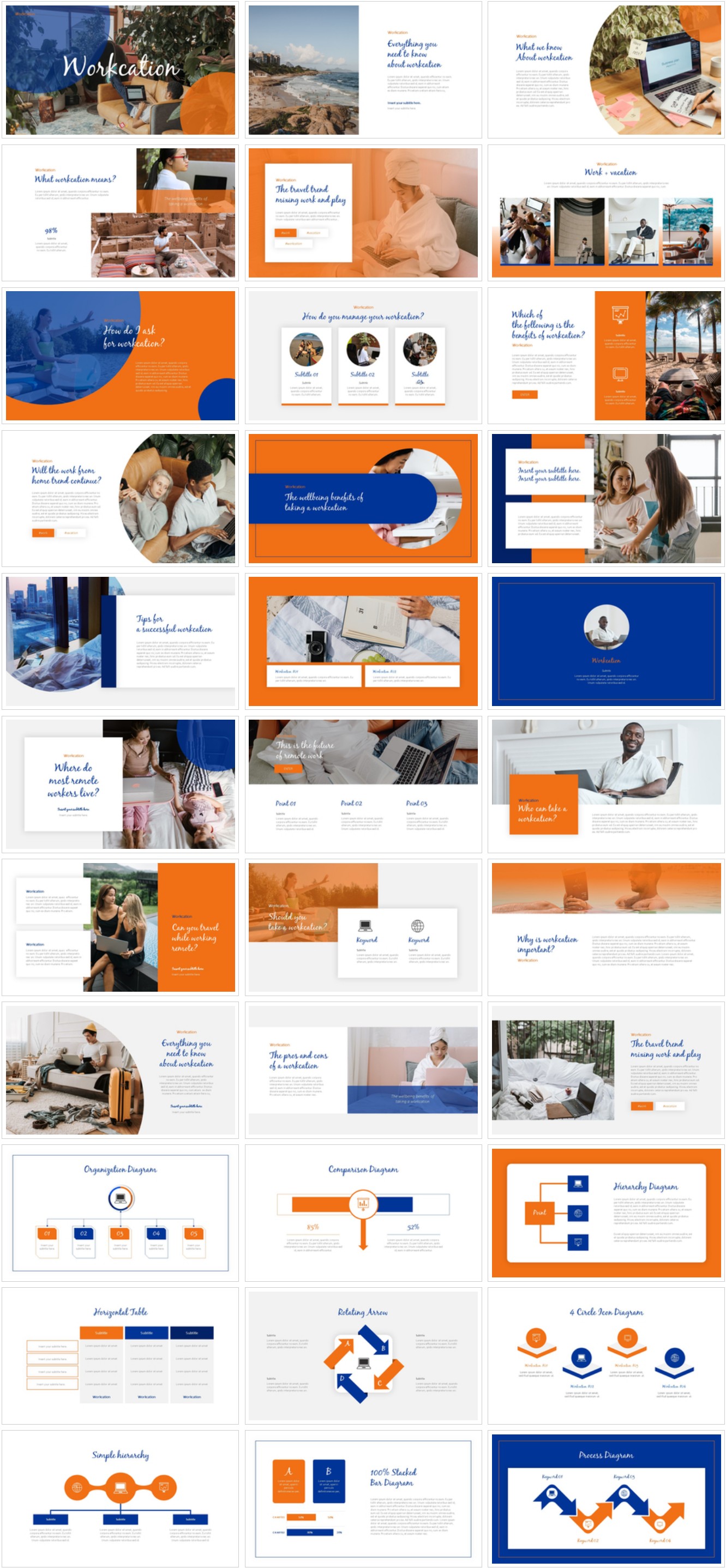 일과 휴가를 함께 하는 합성어인 워케이션을 테마로 제작한 35페이지 템플릿입니다. 테마 컬러 차트로 손쉽게 템플릿 컬러 변경가능합니다. 활용성이 높은 차트와 다이어그램이 포함되어 있습