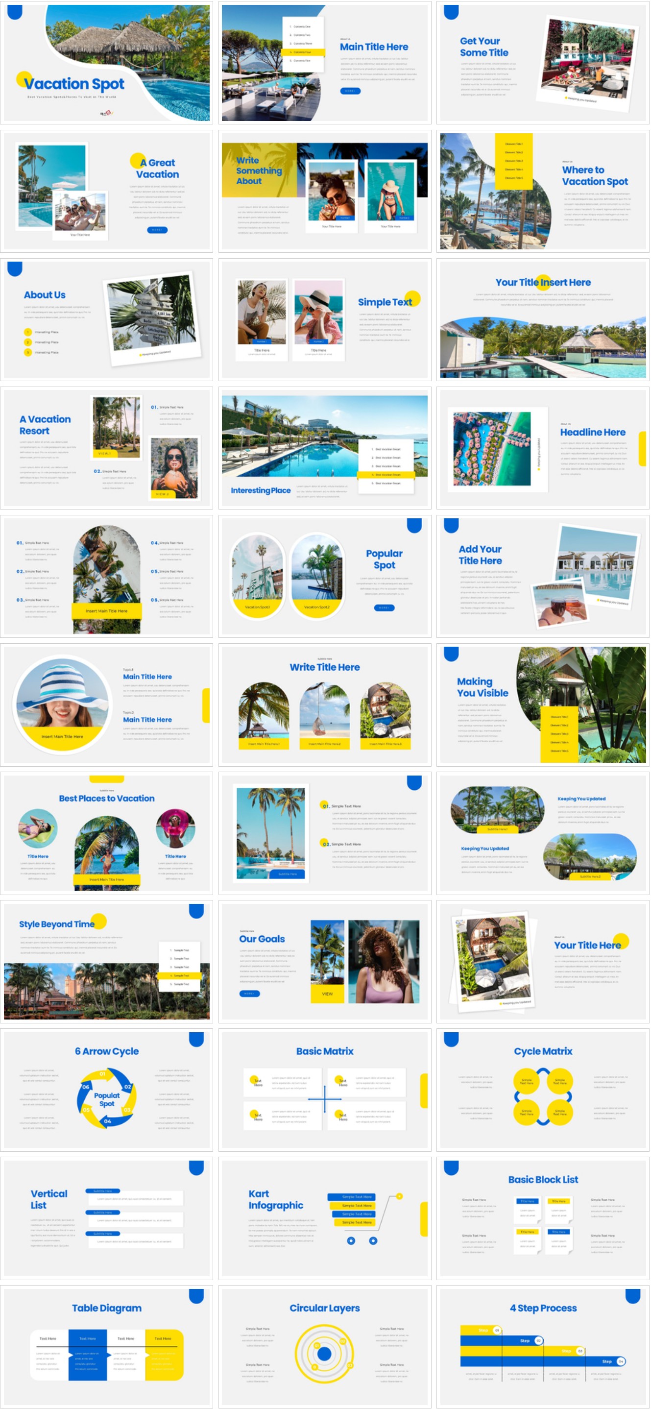 휴가지 Vacation Spot 파워포인트 샘플입니다. 여름 휴가 명소를 테마로 제작한 35페이지 템플릿입니다. 테마 컬러 차트로 손쉽게 템플릿 컬러 변경가능합니다.
