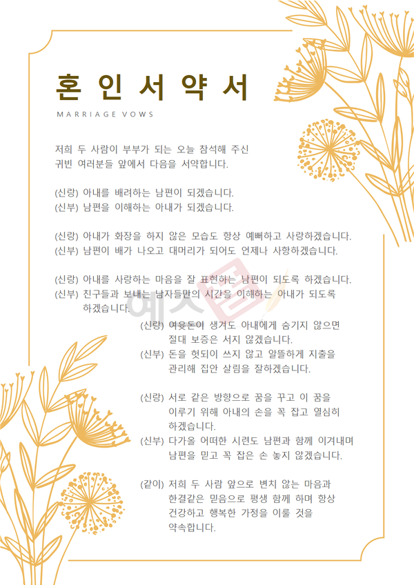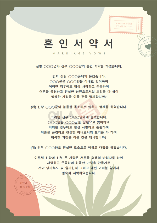 성혼선언문과 혼인서약서를 이용하셔서 예쁜 결혼식을 진행해 보시기 바랍니다.🤵💖👰