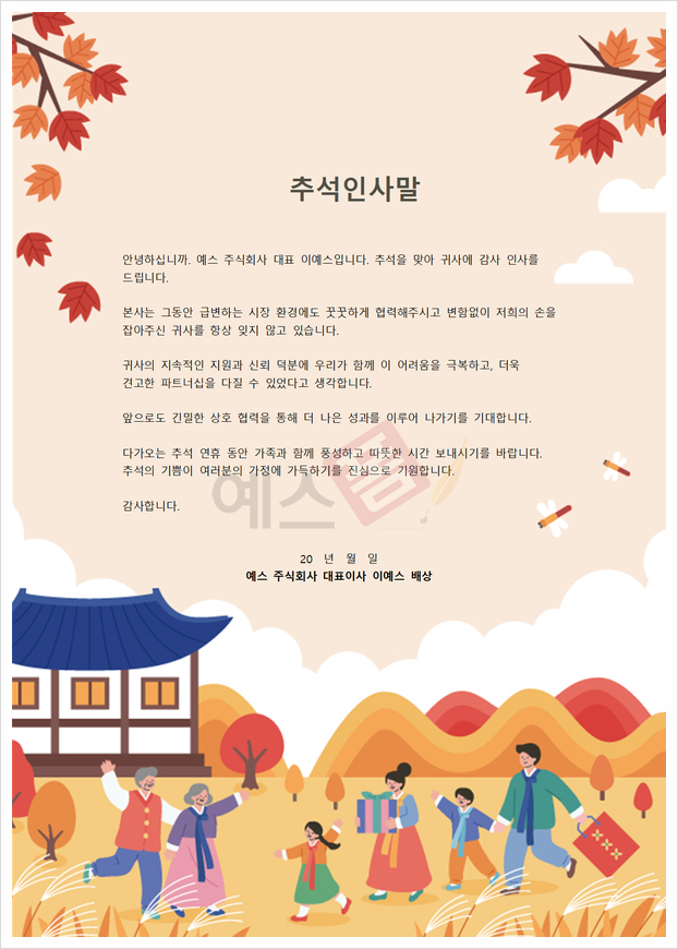이렇게 새롭게 업데이트된 추석 인사문, 추석 인사말 축사 예문, 추석 연휴 안내문을 소개드렸는데요. 예스폼에서 제공드리는 각종 서식 및 양식은 다양한 상황에 맞는 예시가 포함되어 있습니다. 오늘 소개드린 서식 외에도 다양한 한가위 인사말, 축사 예문, 감사 인사 카드, 휴가 안내문 양식, 휴무 안내문 양식 등을 예스폼에서 제공하고 있는데요. 추석 메시지 미리 준비하고 시간 절약과 상대방에게 진심을 담은 마음을 전달해 관계를 더욱 돈독하게 만들어가시길 바라겠습니다.