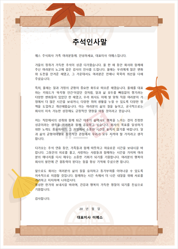 이렇게 새롭게 업데이트된 추석 인사문, 추석 인사말 축사 예문, 추석 연휴 안내문을 소개드렸는데요. 예스폼에서 제공드리는 각종 서식 및 양식은 다양한 상황에 맞는 예시가 포함되어 있습니다. 오늘 소개드린 서식 외에도 다양한 한가위 인사말, 축사 예문, 감사 인사 카드, 휴가 안내문 양식, 휴무 안내문 양식 등을 예스폼에서 제공하고 있는데요. 추석 메시지 미리 준비하고 시간 절약과 상대방에게 진심을 담은 마음을 전달해 관계를 더욱 돈독하게 만들어가시길 바라겠습니다.