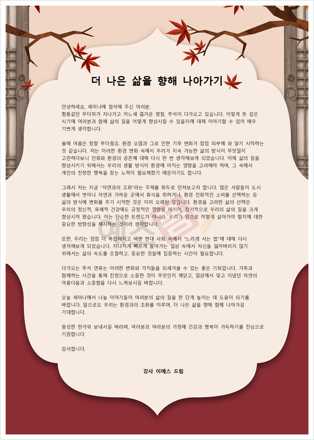 | 추석 인사말(세미나 강의) | 추석 인사말(회원들에게) | 추석 인사말(협력업체 인사) |