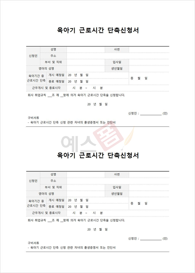 | 출산휴가 신청서 | 육아휴직 신청서 | 육아기 근로시간 단축신청서 |
