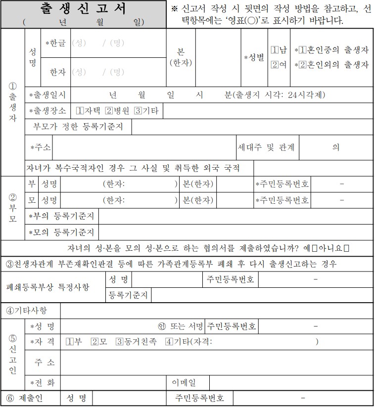 - 혼인외 출생자를 모(母)가 신고하는 경우에는 부(父)를 기재하지 않습니다.