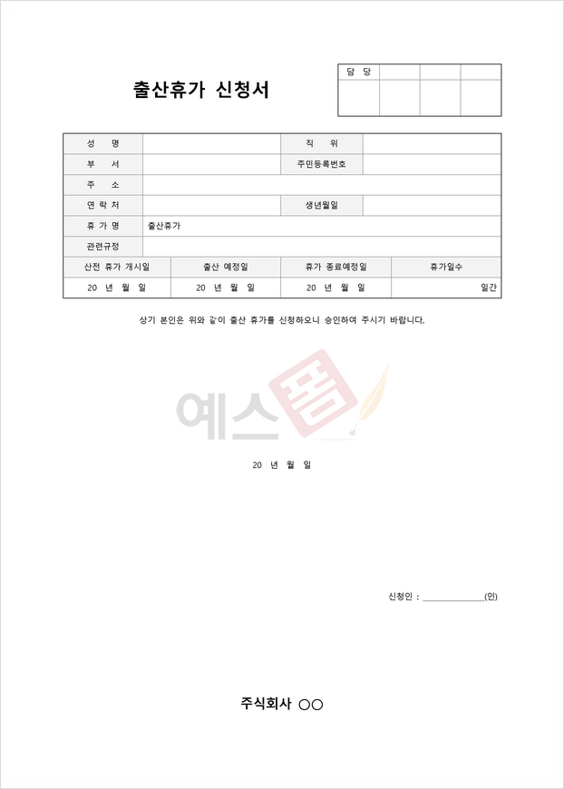 | 출산휴가 신청서 | 육아휴직 신청서 | 육아기 근로시간 단축신청서 |
