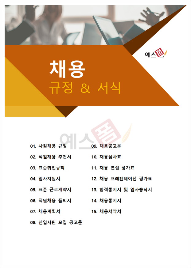 채용규정과 취업규칙(채용, 근로계약, 복무, 인사, 근로조건, 임금 등) 및 별지 서식으로 구성되어 있는데요. 입사지원서, 근로계약서, 직원 채용 품의서, 채용 계획서, 신입사원 모집 공고문, 채용 공고문, 채용 심사표, 채용 면접 평가표, 채용 프레젠테이션 평가표, 합격 통지서, 채용 서약서 등 채용 준비 및 진행을 위한 서식이 함께 수록되어 있습니다.