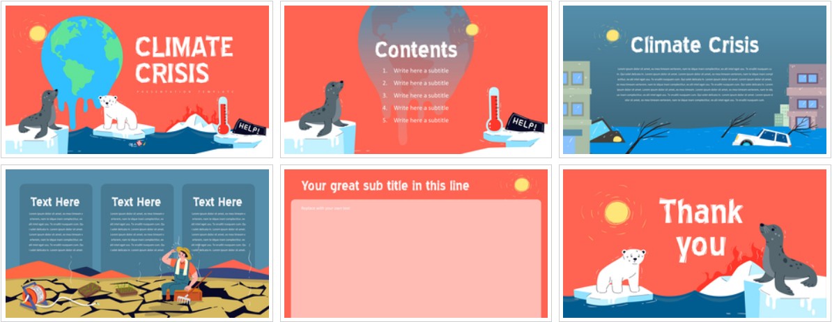 기후위기를 주제로 제작된 파워포인트 배경 템플릿입니다. 기후 변화 관련 일러스트 이미지가 포함되어 있어 활용하기 좋은 템플릿입니다. 6장의 슬라이드로 표지, 목차, 내지, 종지로 서비스