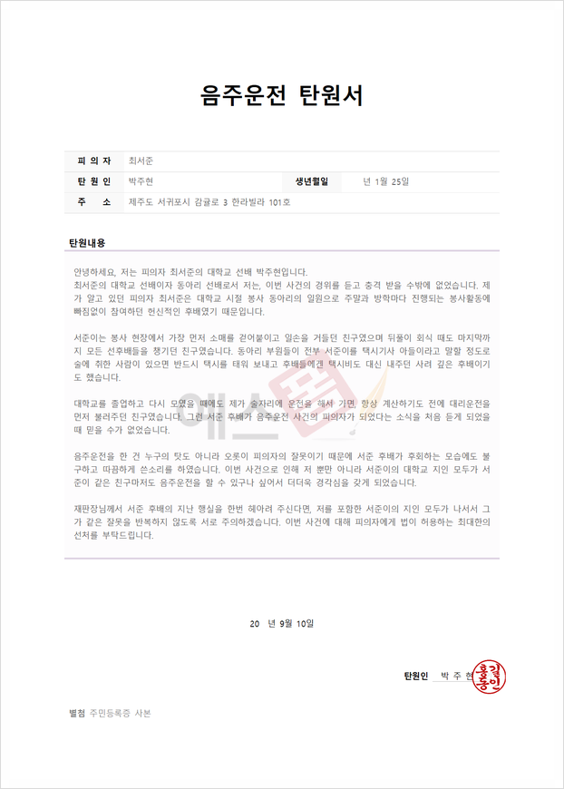 ✔️ 음주운전 탄원서(피의자 대학선배)