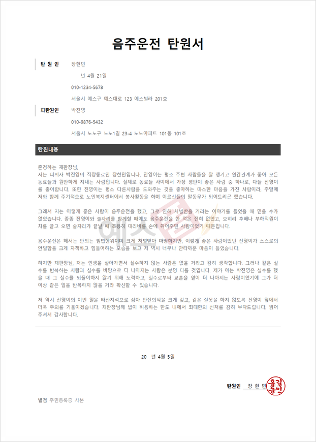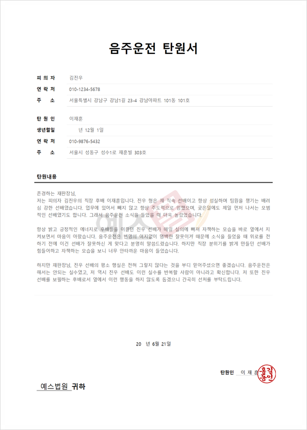 피의자의 성격과 평소 행실, 사건의 경위 등을 구체적으로 설명하며, 법원이 상황을 참작하여 선처를 베풀어 주기를 호소할 때 사용하는 음주운전 탄원서 양식입니다. 탄원 내용에는 탄원인 본인이 피탄원인의 행실을 평소에 어떻게 봐왔는지, 사건의 경위는 어떠했는지, 피탄원인이 얼마나 반성하고 있는지 등을 상세히 명시해야 합니다. 음주운전자의 대학 선배가 음주운전자를 위해 작성한 탄원서 내용이 선처 탄원서 예시, 음주운전 탄원서 예시로 포함되어 있습니다.