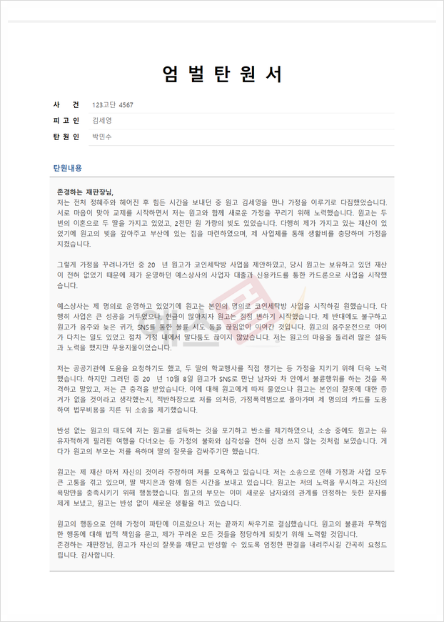 피고인의 처벌을 강화해 줄 것을 법원에 요청하기 위해 작성하는 엄벌 탄원서 양식입니다. 사건의 경위와 피고인의 행위를 구체적으로 서술하며, 엄벌을 요구하는 이유를 명확히 기재할 수 있습니다. 불륜을 저지른 아내에게 강력한 처벌을 요청하는 내용의 예시가 포함되어 있습니다.