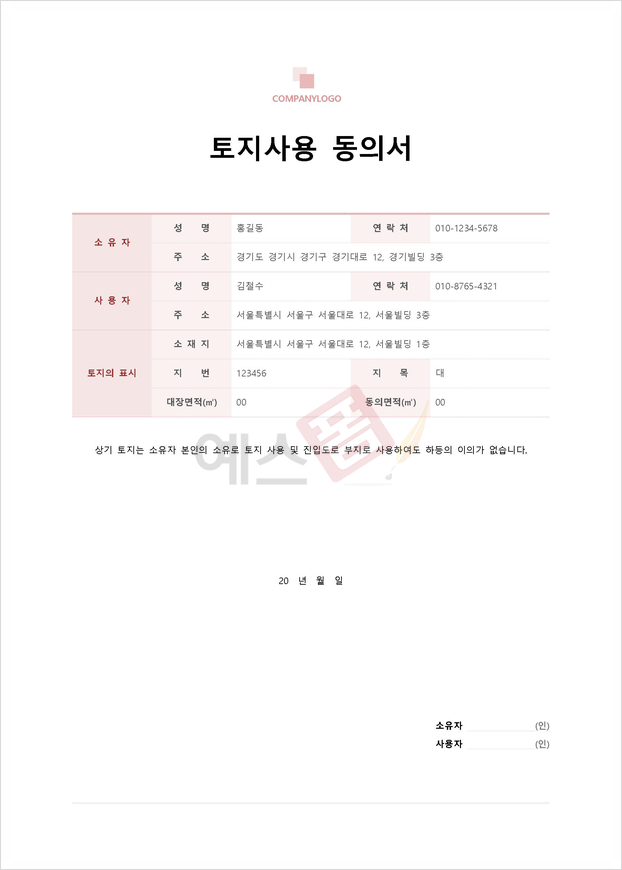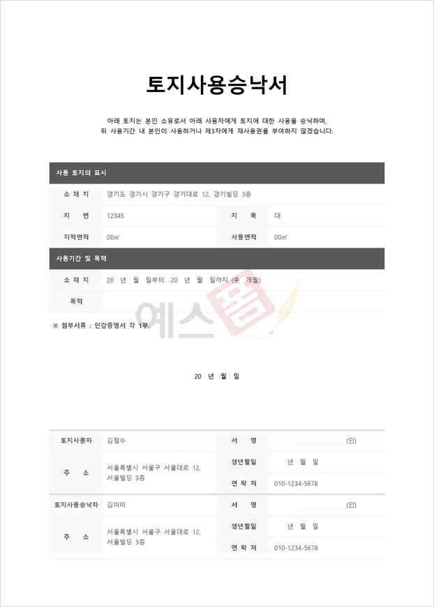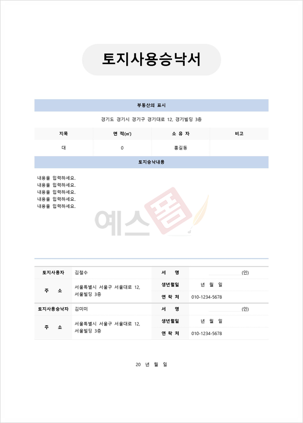 - 문서에 토지 소유자와 토지를 사용하고자 하는 사용자의 이름, 주소, 연락처 등 당사자 정보를 작성합니다.