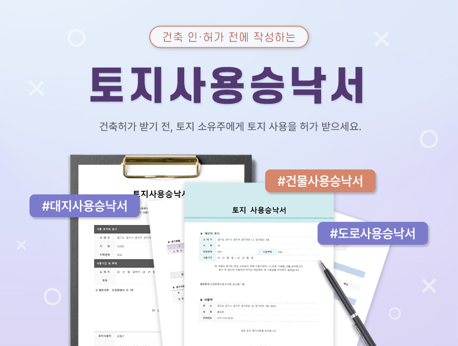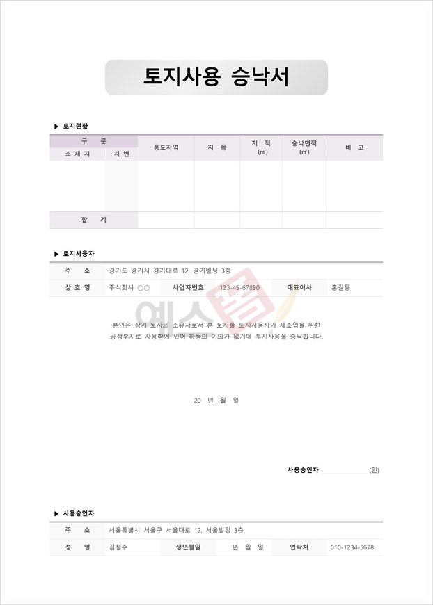 | 토지사용승낙서 (공장 부지) | 토지사용승낙서 (사용목적 서술) | 토지사용승낙서 (개인주택용) |