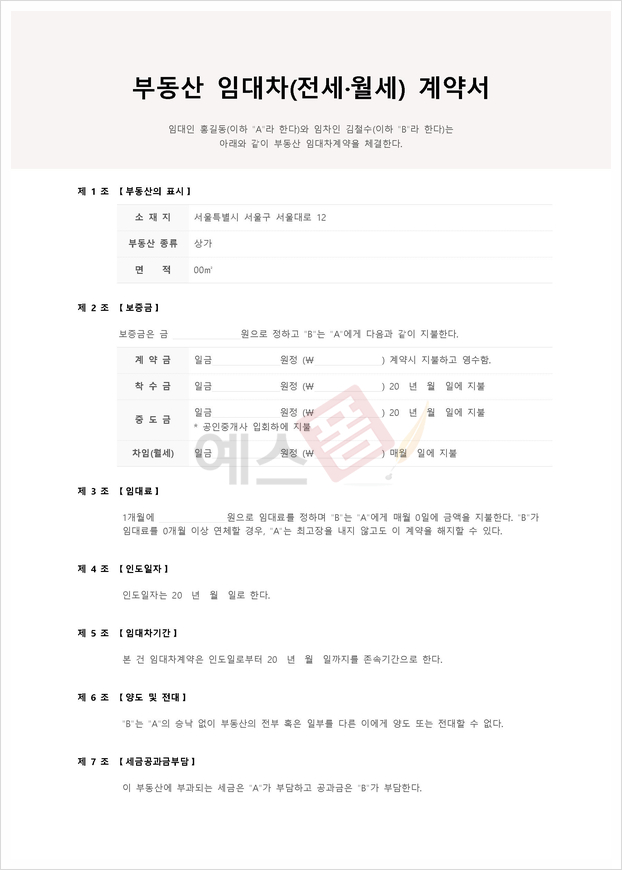 부동산을 임대할 때 사용하는 문서로 임대인과 임차인 간의 권리와 의무 등의 내용을 상세히 기록하여 규정하는 계약서 양식입니다. 보증금, 임대료, 인도일자, 임대차기간, 양도 및 전대 등의 내용을 입력하셔서 아파트, 빌라 등의 전월세 계약을 진행해 보시기 바랍니다.