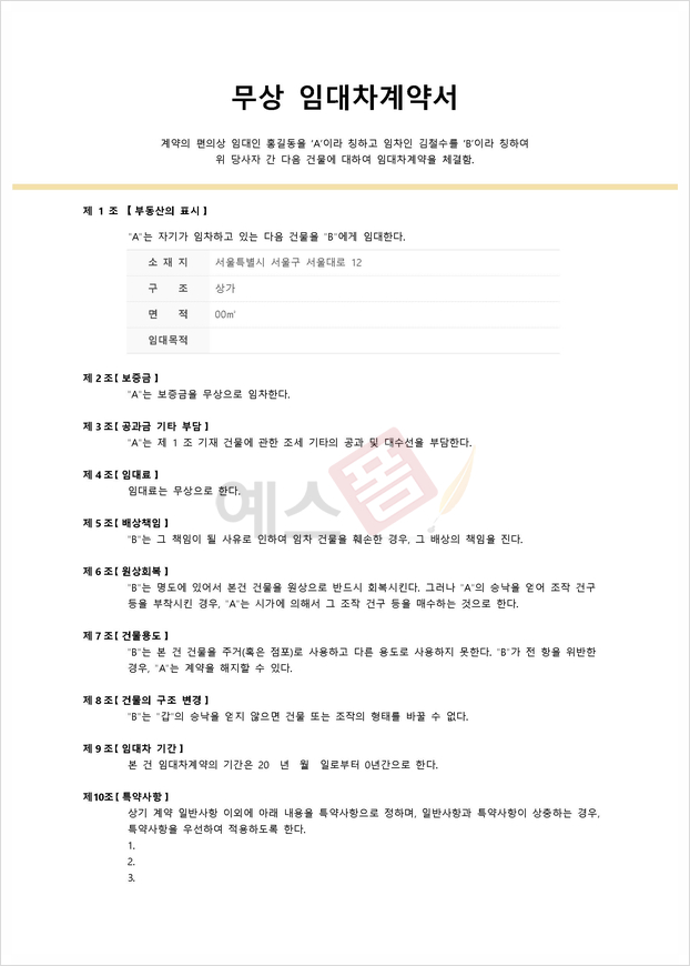| 용도별 부동산 임대차계약서 | 무상 임대차계약서 |