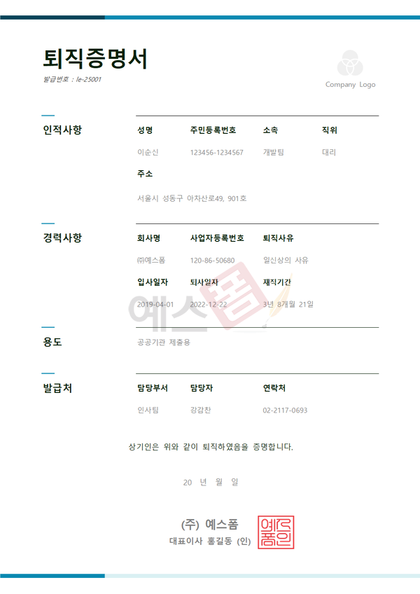 공공  기관이나 금융기관 제출용으로 적합합니다. 불필요한 정보 없이 간결하게 구성되어 있어 다양한 산업군의 기업에서