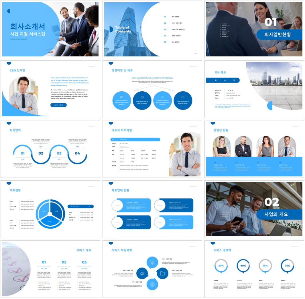 예스폼의 사업 지원 서비스업 회사소개서는 서비스업 회사소개서 템플릿인데요. 사업에 필요한 지원 서비스를 제공하는 회사에서 활용하기 좋습니다. 비즈니스 이미지가 포함되어 있는데요. 트렌디한 고화질 이미지가 삽입되어 있으며, 각 슬라이드의 원하는 이미지만 선택하여 주제에 맞는 이미지로 편리하게 교체해 보실 수 있습니다.