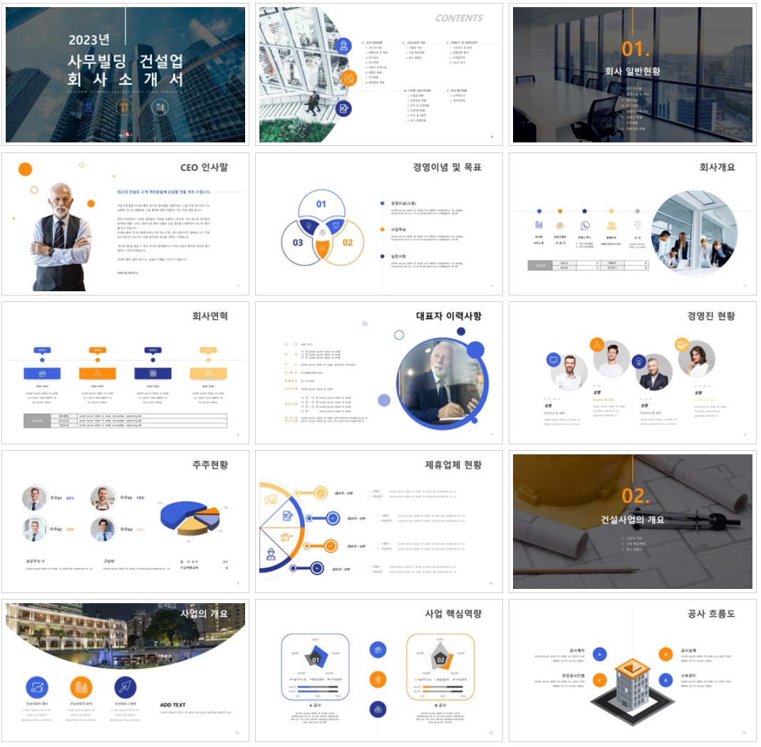 오피스텔, 상업시설, 지식산업센터, 업무시설 등 [2023년] 사무빌딩 건설업 회사소개서 템플릿 양식입니다. 사무,상업용 건물 건설업 관련 이미지와 관련 도표 등이 포함되어있는 템플릿입니다. 0