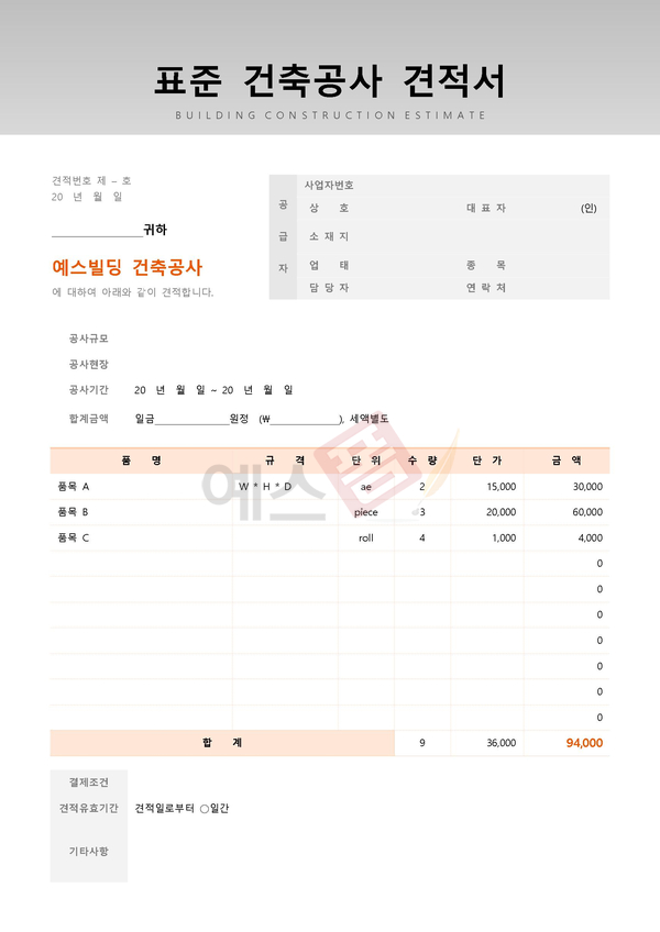 | 공사견적서 | 표준 건축공사 견적서 (유효기간) | 표준 건축공사 견적서 (견적 유효기간) |