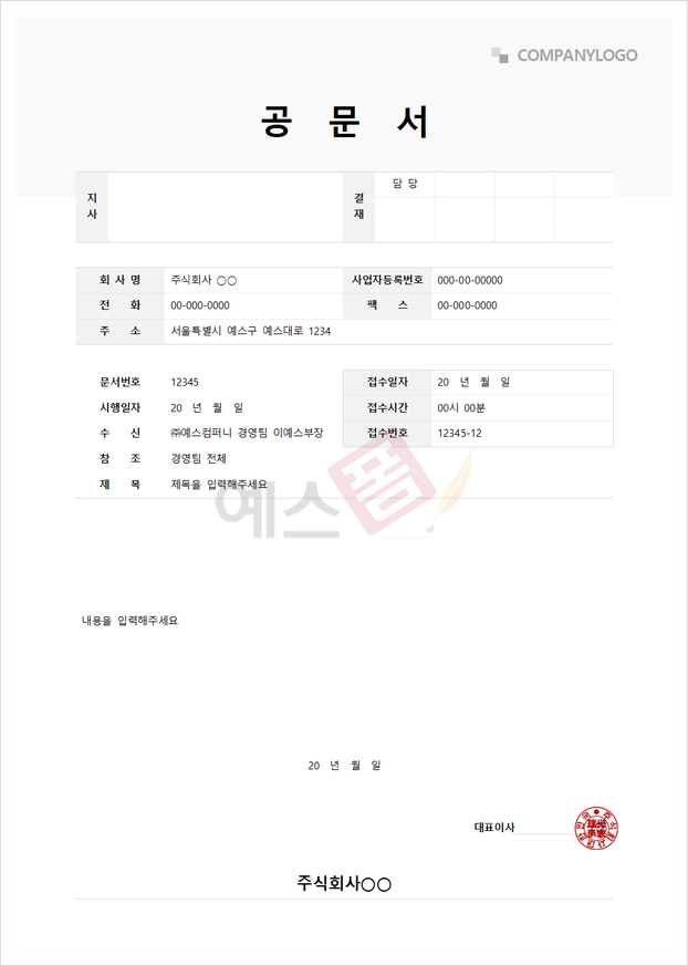 공문을 보내는 회사명, 사업자등록번호, 전화, 팩스, 주소를 작성할 수 있고, 공문을 받는 수신, 참조, 접수일자, 시간, 번호, 제목 등 기재할 수 있도록 구성되어 있습니다.