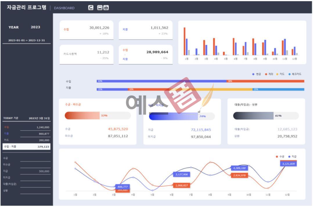 NEW 자금 관리 Program은 수입/지출, (미) 수금/지급, 차입금(상환) 등의 회사 자금을 효율적으로 관리할 수 있도록 제작된 자금 관리 프로그램입니다. 거래처별 · 자금별 현황, 차입금 현황, 월간 · 월별 · 연도별 현황, 거래처 · 계정별 원장, 일계표(월계표) 등 다양한 형태의 검색 기능과 함께 연간 세무 달력이 자동 업데이트 기능을 제공합니다. 자금 일보(결산보고), 지출결의서 자동 생성 기능을 제공하며 대시보드로 시각화된 데이터를 확인할 수 있습니다.