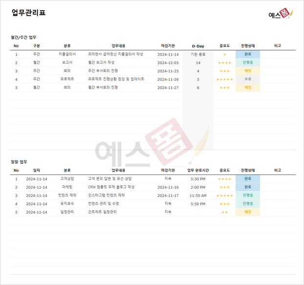 하지만 체계적인 업무관리표만 있다면 하루의 업무를 깔끔하게 정리하고, 더 효율적으로 일할 수 있는데요.