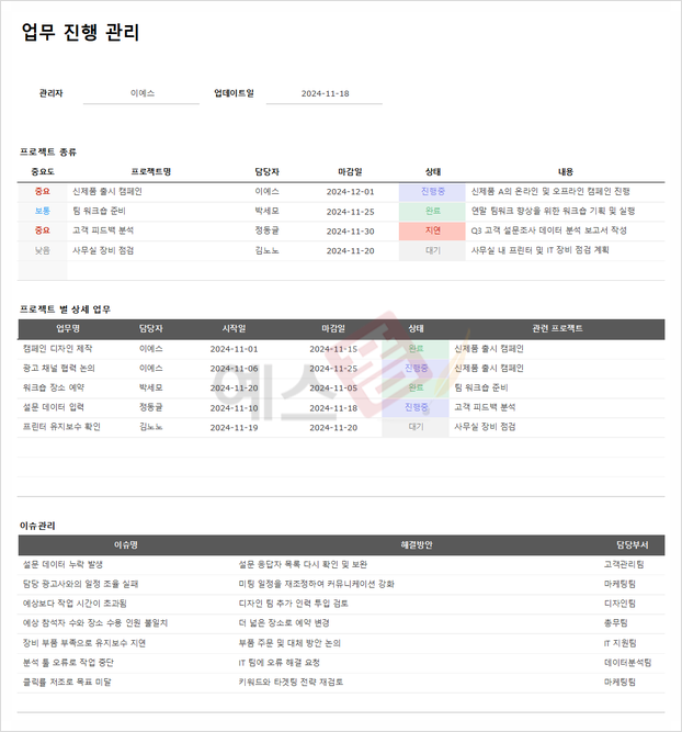 일정 기간 동안 진행되는 프로젝트나 업무의 진행 상황을 일목요연하게 정리한 문서로서, 매일 또는 매주 단위로 업데이트되며 중간 점검이나 최종 보고 시 참고 자료로 활용됩니다.