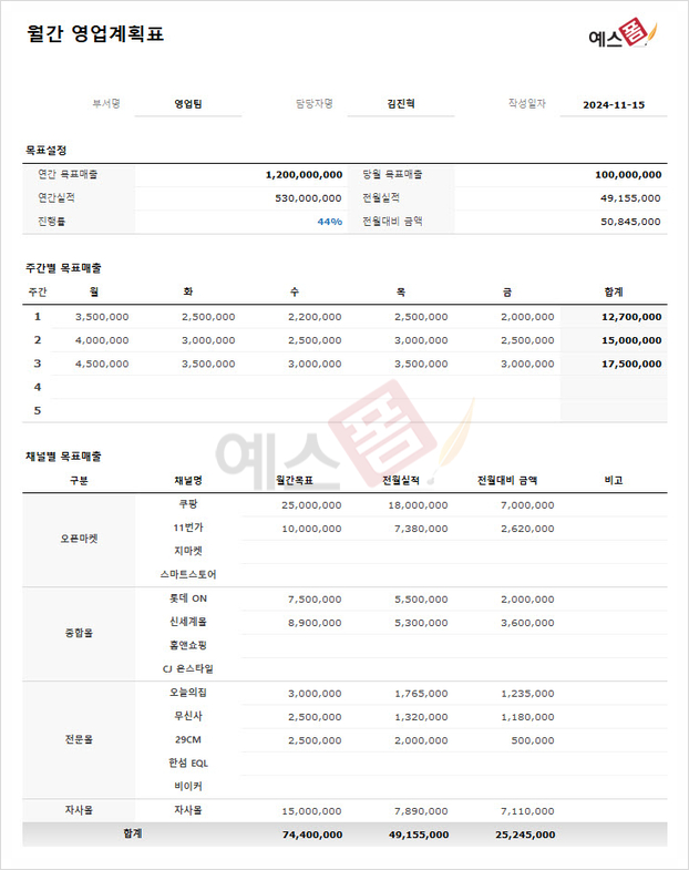 영업 부서에서 작성하는 문서로 매출 목표 설정, 고객 유치 전략 수립, 마케팅 계획 수립 등의 내용을 포함하며 분기별 또는 연도별로 작성되고 실적 분석 및 평가 시 유용한 자료로 활용됩니다.