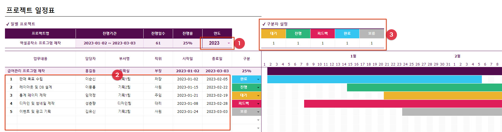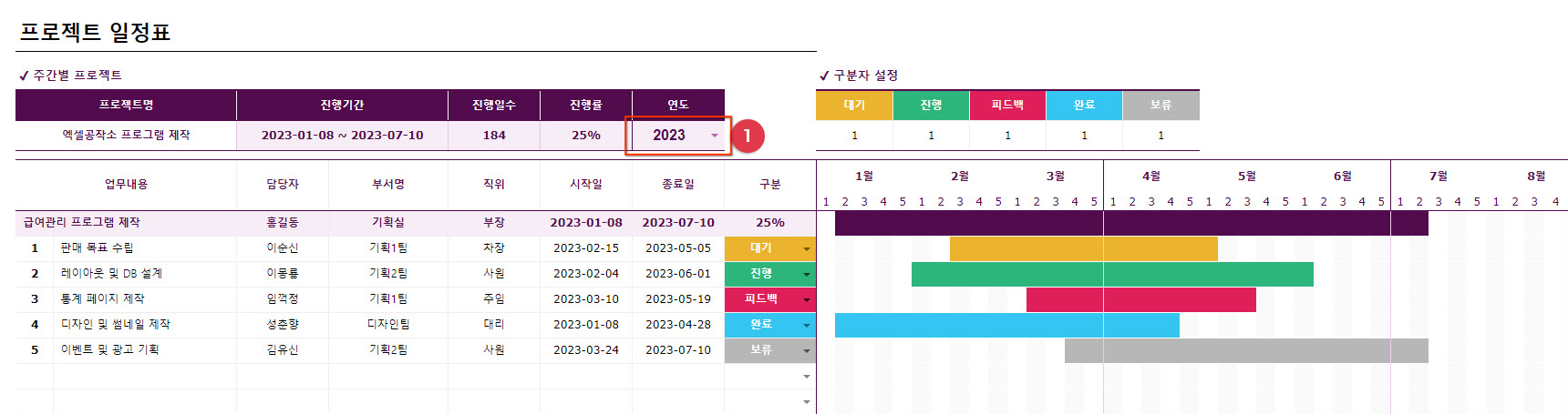 설정한 연도의 프로젝트 일정을 일별로 관리할 수 있는 시트입니다. 연도를 설정하면 해당 연도의 일자가 표시되고 업무내용, 담당자, 시작일, 종료일, 구분 등을 입력하실 수 있습니다. 복수의 프로젝트 입력이 가능하며 업무일자, 설정한 구분자 등이 간트차트 형태로 자동으로 일정표에 반영되어 업무 진행상황을 한눈에 파악하실 수 있습니다.