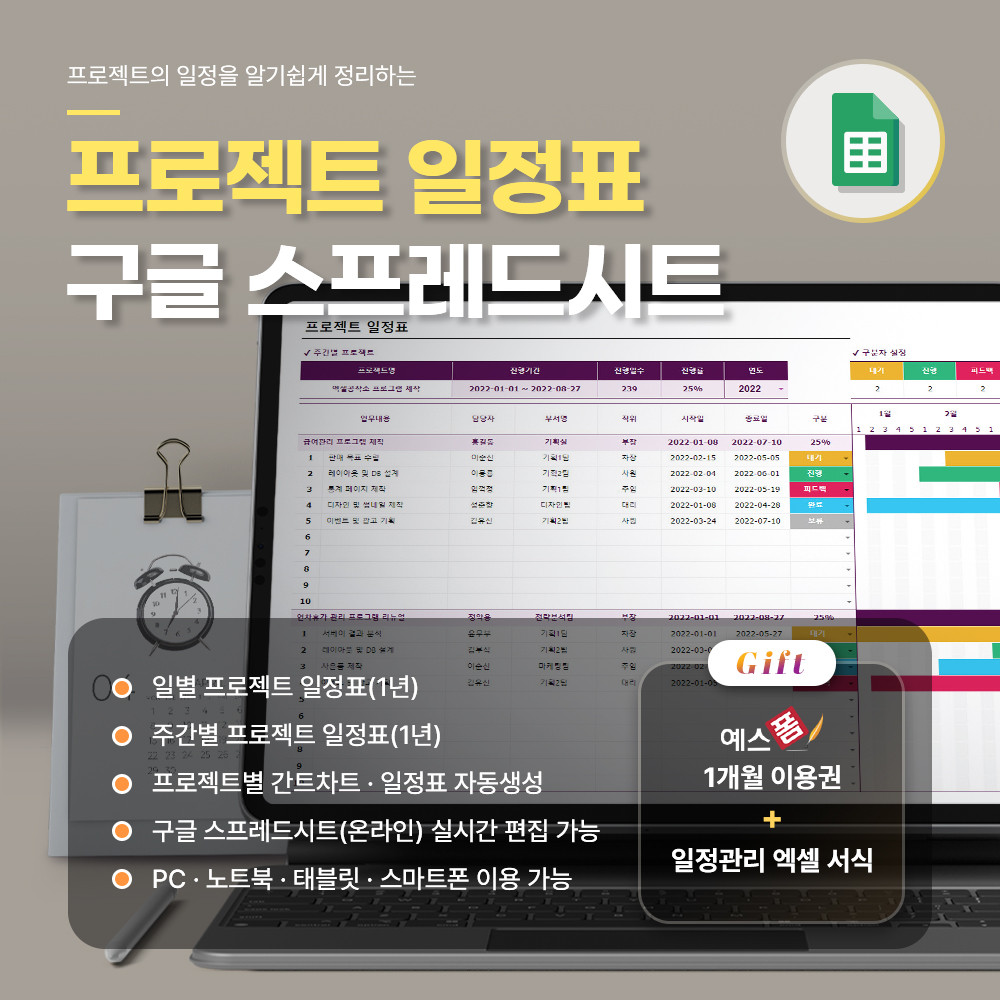 마감일에 맞춰 작업을 완수하기 위해서는 본격적인 작업에 앞서 예상 소요시간을 산정한 뒤, 업무 계획을 세워두는 것이 좋은데요. 효율적인 업무 진행을 하기 위해 일별 또는 주간별로 프로젝트 일정표를 작성하고 계신 분들이 많으실 것 같습니다. 오늘은 이러한 일정 관리를 보다 쉽고 편리하게 진행할 수 있도록 예스폼에서 서비스하고 있는 엑셀 템플릿 프로젝트 일정표와 구글시트 프로젝트 일정표를 소개해드리고자 합니다.