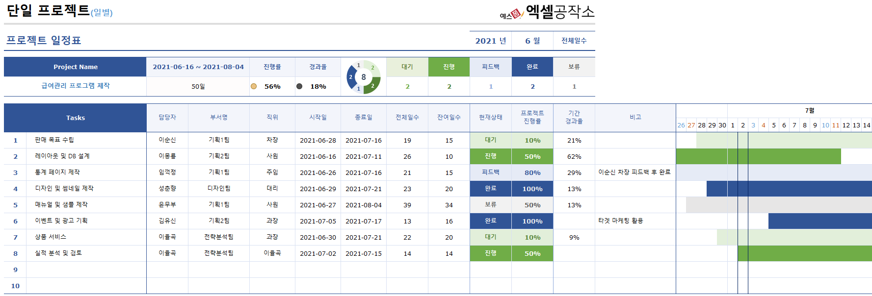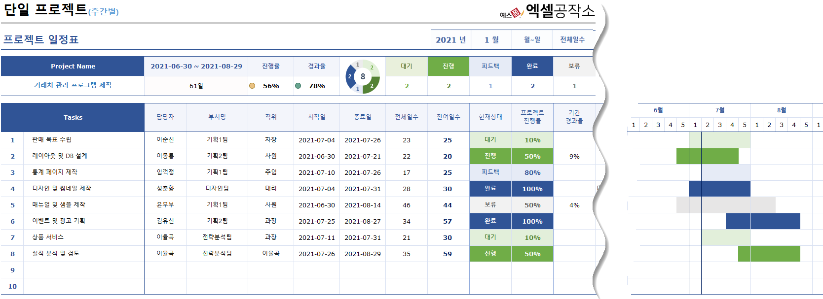아래에서 소개해드리는 프로젝트 일정표 엑셀 양식과 구글 스프레드시트를 활용하셔서 프로젝트 및 업무 스케줄을 간트 차트를 통해 간편하게 확인하고 관리해 보시기 바랍니다.