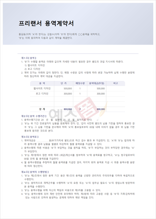 예스폼에서는 프리랜서 용역계약서 양식을 제공하고 있습니다. 웹사이트 디자인과 로고 디자인 등의 용역을 위탁하는 목적을 가진 프리랜서 용역계약서로 각 용역에 대한 계약 단가와 예정 수량이 명시되어 있습니다. 해당 계약서를 통해 용역 수행 기간은 특정 날짜로 정해져 있으며 “B”는 해당 기간까지 납품을 완료해야 함을 알 수 있습니다. 용역료는 완료 후 검수를 통해 지급되며 “B”가 본 용역의 수행에 있어 안전을 유지하고 책임을 져야 함을 명시하고 있습니다. 또한, 결과물에 대한 납품과 검수에 관한 내용과 비밀준수, 손해배상 조항, 계약보증금 및 분쟁해결 등의 규정도 포함되어 있습니다.