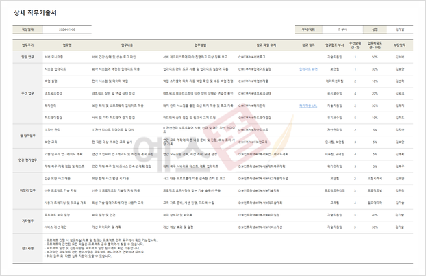 특정 직무나 업무 담당자가 수행하는 업무의 세부사항을 기록하는 상세 직무기술서 양식 및 예시입니다. 기본 정보에는 작성일자, 부서/직위, 성명 등이 포함됩니다. 이를 통해 문서의 신뢰성과