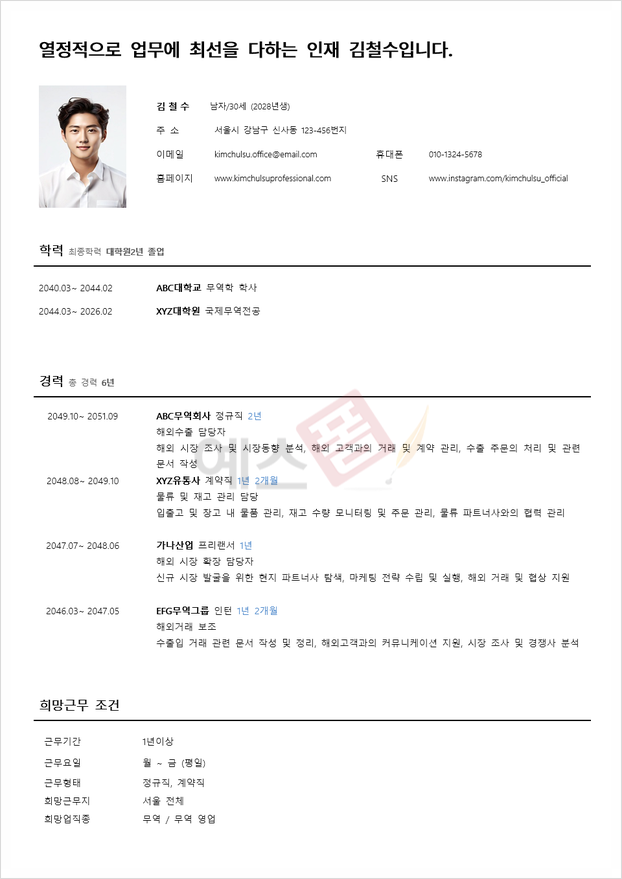 이 밖에도 예스폼에서는 자신의 역량과 목표를 명확하게 표현하여 제출할 수 있는 무역 분야 이력서 양식 역시 제공 중에 있는데요. 해당 양식 역시 개인의 이력을 정리한 내용이 예시로 포함되어 있는 양식이므로 만일 무역 분야 관련 이력서 작성을 진행하고자 하시는 분들이라면 해당 양식을 활용해 보시는 것을 추천드리겠습니다.