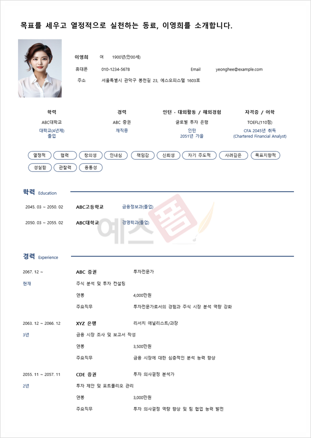 뿐만 아니라 예스폼에서는 자신의 경력이나 학력, 기술 등에 대한 정보를 정확하게 기입할 수 있는 금융 계열 지원자를 위한 양식 역시 제공 중에 있는데요. 특정 개인의 이력을 정리한 예시가 포함되어 있는 양식이므로 만일 금융 계열 관련 직무에 처음 지원하게 되는 이들 또는 이직을 희망하고자 하는 이들이라면 해당 양식 및 예시를 활용해 서류 전형에 합격률을 높인 이력서 및 자기소개서를 완성해 보시기 바라겠습니다.